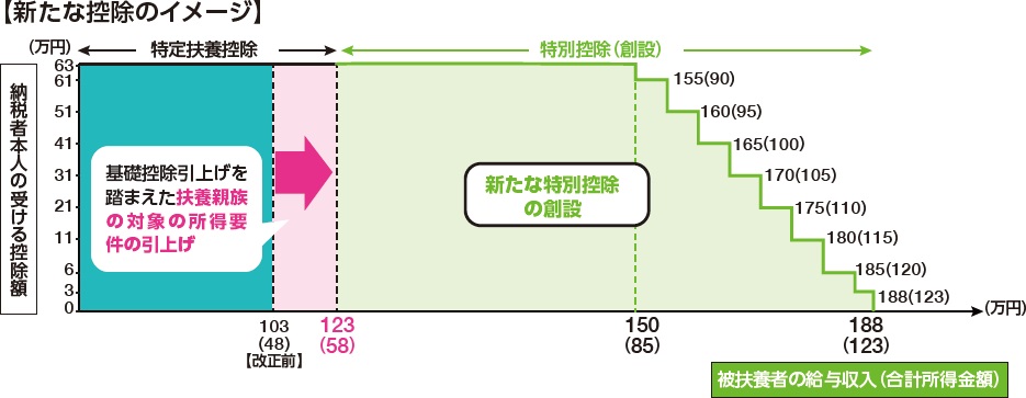 特定親族特別控除が創設され、生計を一にする年齢19歳以上23歳未満の親族等(配偶者及び青色事業専従者等を除く。)で、前年の合計所得金額が58万円超123万円以下の方がいる場合に所得控除の適用が受けられるようになりました。